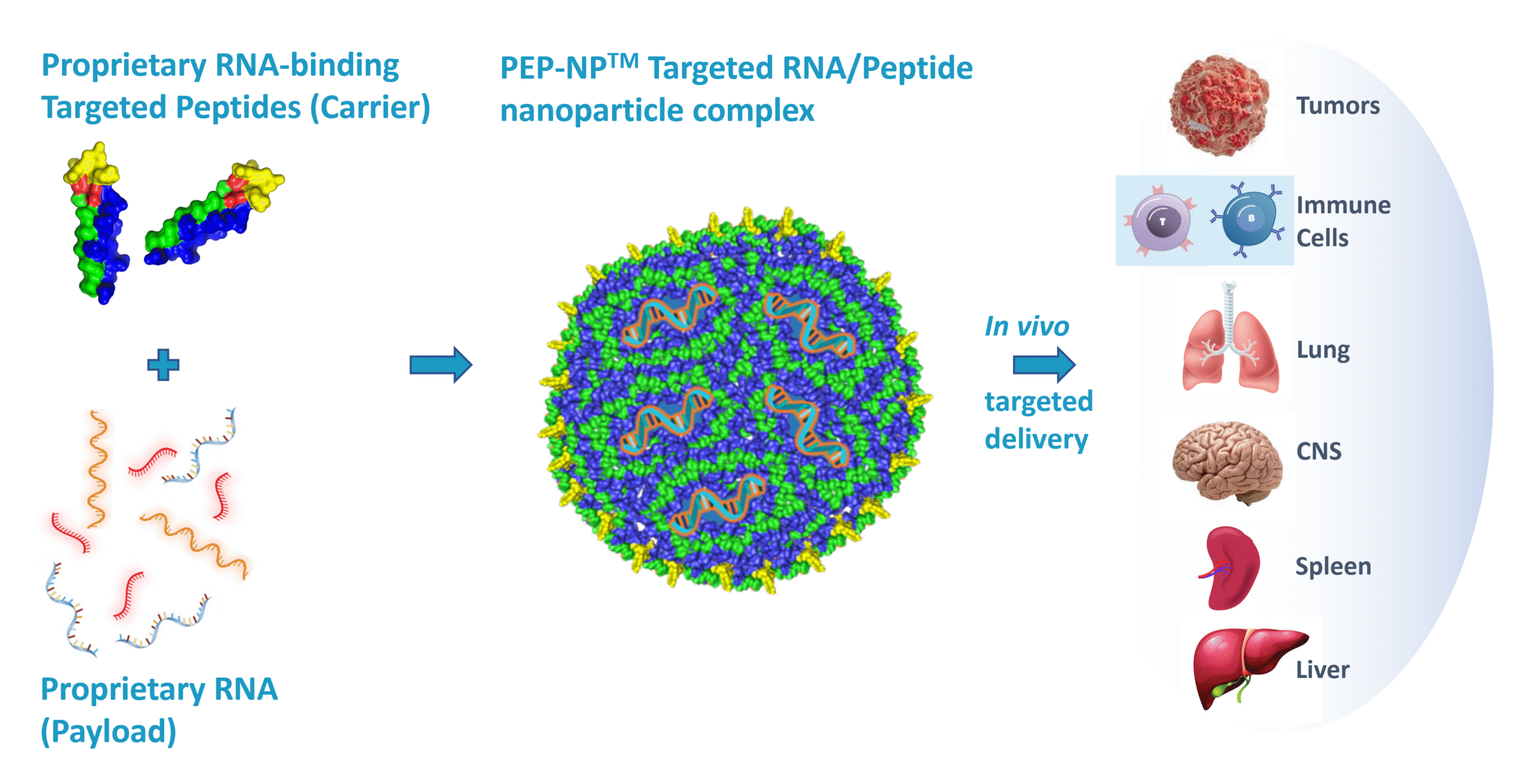 Aanastra’s PEP-NP™ peptide nanoparticle system is designed to deliver RNA to the true source of disease—mutated or deleted genes that drive pathology, not just their secondary effects. By custom-selecting targeting peptides (using AI and experimentation), we enable efficient, repeatable delivery, bypassing off-target toxicity, immune barriers, and downstream signaling traps.