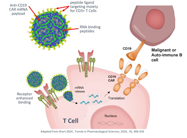 In vivo CAR T generation with lentiviral or lipid nanoparticle vectors expands accessibility but is limited by challenges in repeat dosing due to immunogenicity and liver toxicity. Aanastra’s peptide-based nanocarrier PEP-CAR™, targeting CD3 receptors, enables efficient in vivo engineering of T cells to express anti-CD19 CAR with demonstrated efficacy in mice—rapid depletion of CD19+ B cells and safe, repeated dosing for long-term therapy.